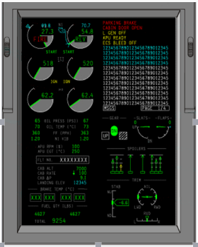 發參仿真顯示器為試驗座艙中重要顯示設備。主要顯示發動機指示和機組警告信息,包括指示飛機各系統工作狀態,提供文字、圖形、音頻信息,出現故障時提示故障和發出警告。主/次發動機參數及襟翼位置、燃油量、起落架位置、警告信息、顯示狀態頁、各個系統頁及維護頁信息。